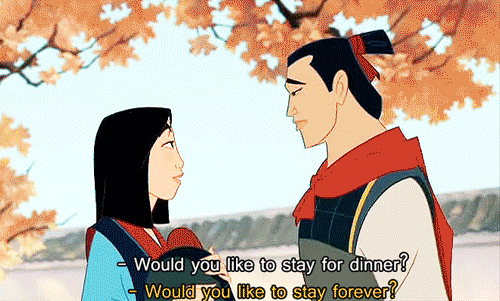 It's the end of the semester, with only finals week standing between us and summer break. For many, it's the end of your very first year of college. Congratulations—you made it! Looking back, this year probably already holds a lot of important memories from your college career, and as you move through your next three years of school and even look back after graduation, your freshman year of college will hold a special kind of nostalgia for you. There are a lot of great moments to remember from your freshman year, and I think we should commemorate those moments before we dive into finals and summer. To that end, I've decided to immortalize some iconic first-year-of-college moments the best way I know how...with Disney GIFs. So, without further ado, here is your freshman year of of college in "Mulan" GIFs.