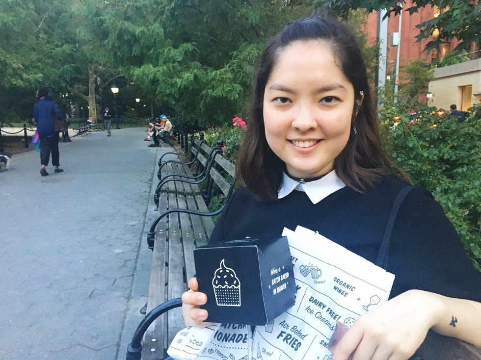 After getting our order, we headed over to the bakery. For a space barely large enough to fit a couple of tables by the window, the tiny bakery still offers a staggering large selection. For sale is anything from a full layered cake, to matcha chocolate babkas, to push pops (check out the full menu here.) On one wall is a row of cards with puns like “You Wanna Piece of This?!” the other, a “You Batter Believe It!” neon lit sign. And just underneath that, three hot pink Swell bottles containing various milk alternatives. Per recommendation from a Sweets by CHLOE worker, we left with two cupcakes: PB&J and a classic Red Velvet. Toting our food to the nearby Washington Square Park, we ate on a bench watching the sunset.