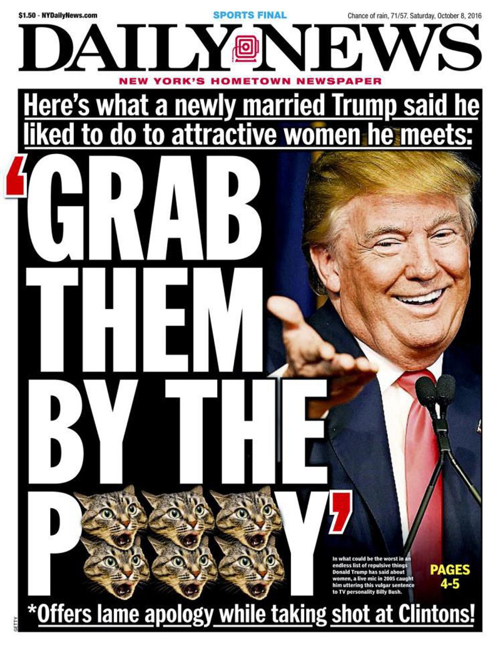 The above photo seems like an appropriate place to start for the accusations against Trump. Quoting Trump saying he likes to, "grab them (attractive women he meets) by the..." well you can read. How about the accusation of Trump mocking a reporter who has a mental disability. Better yet, his slew of racist, misogynistic, and homophobic quotes which I do not feel necessary to post. Nevertheless, throughout each of these events captioned in every headline, from the appropriate political parties gossip rag to the top new stands, I stood behind Trump, and this is where I intended to become personal.