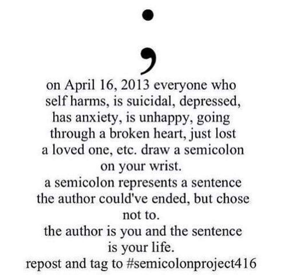 I wear this semicolon as a symbol of hope. I wear this semicolon as a symbol of life and of love. I wear this semicolon to show others that I am here to support them. I wear this semicolon to also support myself. I wear this semicolon next to my scars to remind myself of the decisions I've made. I wear this semicolon because it makes me feel stronger than I am and reminds me I am the author of my own story. I can decide when my story will end.