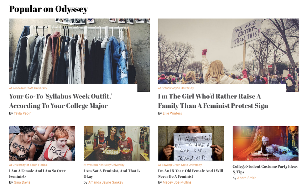 I logged into Odyssey the other day, and noticed that under the "Popular on Odyssey" tab, 4/6 articles were about not being feminist - and why that's okay! If you know me at all (or share a similar mindset with me), you can understand why this made me mad.