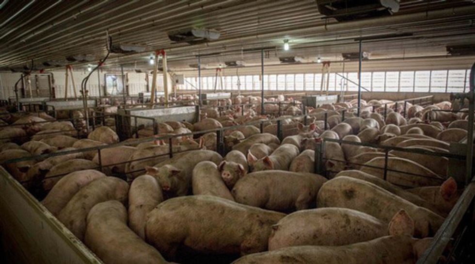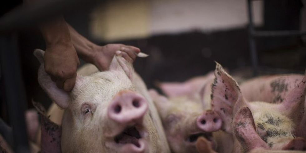 As for pigs, they are often kept in metal gestation crates which do not allow them to move. Just like cows, pigs are repeatedly impregnated. While piglets are allowed to be nursed by their mother for about two to four weeks, they are then castrated without anesthesia, placed in stacked wire caged and then fed synthetic milk. Once they are able to eat solid foods, they are transferred to crowded pens for six months until they are slaughtered. This is their entire life.