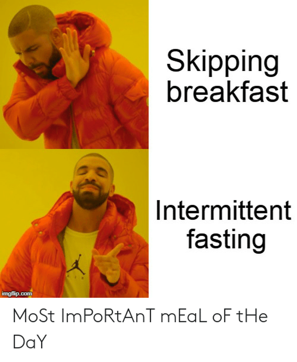 So imagine how happy I was when I found a way of eating that insisted we skip breakfast rather than insisting I force it down my throat regardless of if I wanted it or not. IF assured me that there are health reasons to skip breakfast and that I can gleefully skip it if I want and justify it to other people. This is probably the reason I'm happiest about IF — it encourages me to listen to my body and not eat food first thing in the morning, despite the hype about it being the most important meal of the day.