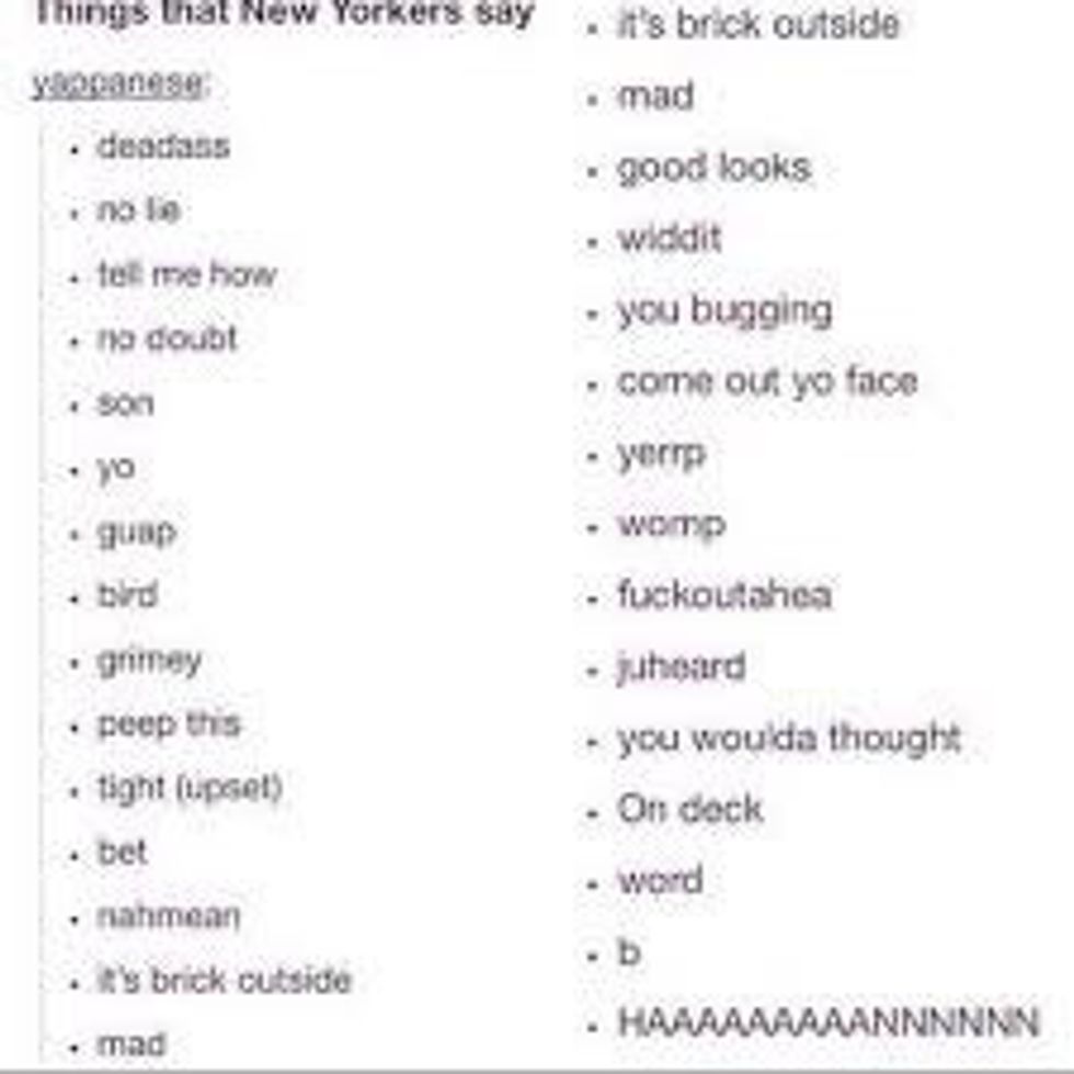 Fuggedaboudit, caw-fee,mudda,awe-nty, the list goes on. Although you don't realize it, you have this impeccable godfather accident that lets everyone knows you're from New York. Hilariously enough this accent used to be associated with lower class people because they couldn't speak proper english but now it seems like most native New Yorkers speak like this. Yeah you don't realize it and neither do your fellow New Yorkers but people don't let you live it down.