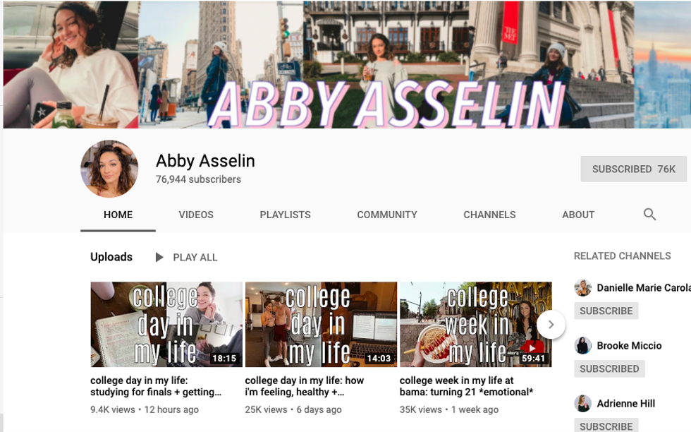 Abby Asselin is a college student at the University of Alabama who posts lifestyle videos. She frequently posts "day in my life" videos and try on hauls. Abby just seems like a very genuine person and she helps me want to be as productive as she is.