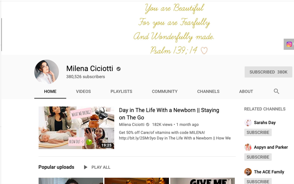Milena Ciciotti could quite possibly be my favorite youtuber at the moment. She and her husband Jordan just had their daughter Alethea so there are a lot of videos about being a young mom being posted. Milena also posts hauls, makeup/ beauty related videos, and personal vlogs. She also is a Christian youtuber and keeps Christ in the center of her life.