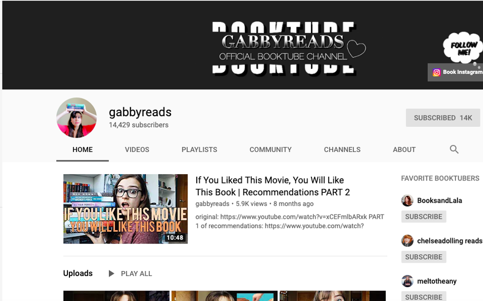 Gabbyreads is my favorite booktuber. If you haven't heard of booktube, it's basically just the part of youtube that focuses on books. She is really funny and is consistent in posting new videos. She reviews books does recommendation videos, and monthly "wrap-ups" of all the books she's read each month. If you love to read you will love Gabby!