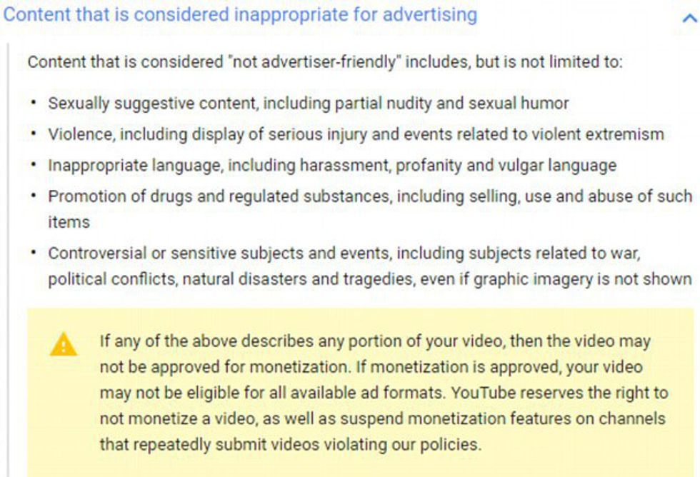 The above is the exact guidelines that YouTube provides in their content guidelines. As you can see, most of this is reasonable. Selling drugs on YouTube? No YouTube money for you. Pornography on YouTube? No YouTube money for you. What’s driving creators insane, is the following: