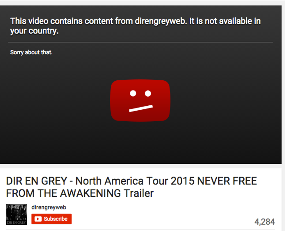 Over the course of this week, several YouTube channels from Japan have been blocked in the United States thanks to the launch of YouTube Red. Even channels from well-known acts such as Dir en Grey or AKB48, as well as sonymusicnetwork and Columbia Music Japan, can no longer be accessed by American users. All you get is the “:/” face and a tagline in which tells you that the content you are trying to access isn't available in your country. Here is a screenshot from the channel direngreyweb, which is pretty ironic considering the video is for their North American tour: