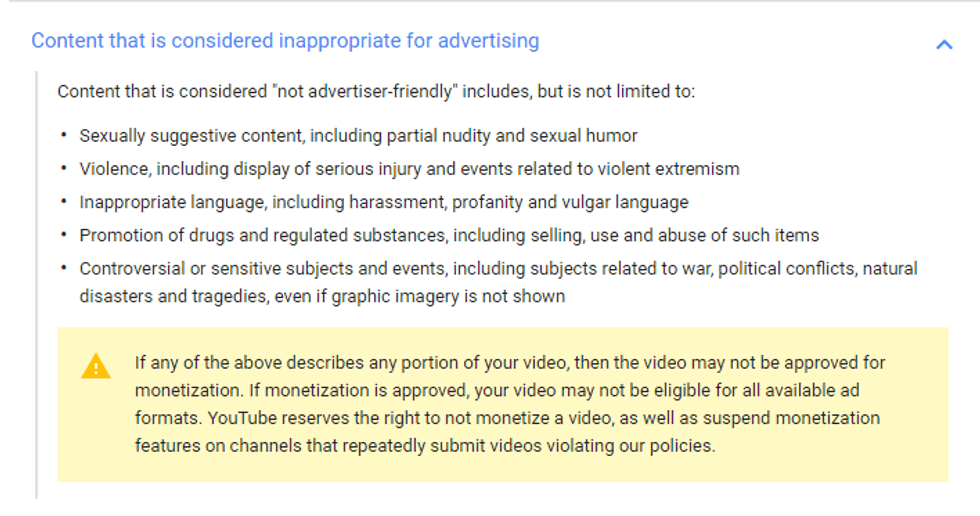 What are these guidelines you may ask? The broad term states that any content that is not "advertiser-friendly" will not be eligible for monetization. A more specific look at these guidelines reveals that things like sexual humor, inappropriate language (including profanity or vulgar language), and "controversial or sensitive subjects and events, including subjects related to war, political conflicts, natural disasters and tragedies, even if graphic imagery is not shown" are not allowed in videos if they wish to be monetized. If a channel does not comply with these guidelines, they can be permanently suspended or banned from monetizing their videos. There are some of the guidelines that I agree with (such as the partial nudity, violent extremism, and promotions of drugs) but the the overarching question here is what does this do to the idea of freedom of speech and being yourself (as YouTube boasts as a selling point for its creators).