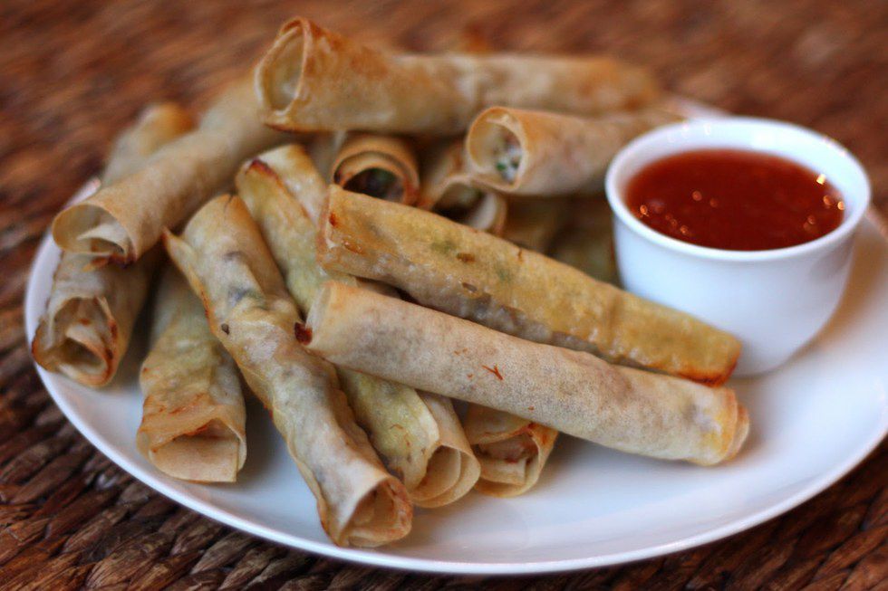 These small egg rolls make a great side dish or appetizer treat. They're normally filled with pork and vegetables such as carrot and cabbage, and can be served with a side of sweet chili sauce.
