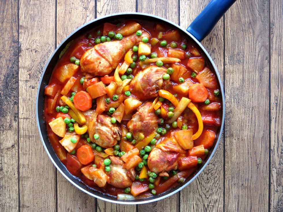 Afritada is a red stew that can be made with beef, pork or chicken mixed with many vegetables like carrots, bell peppers, potatoes and peas.