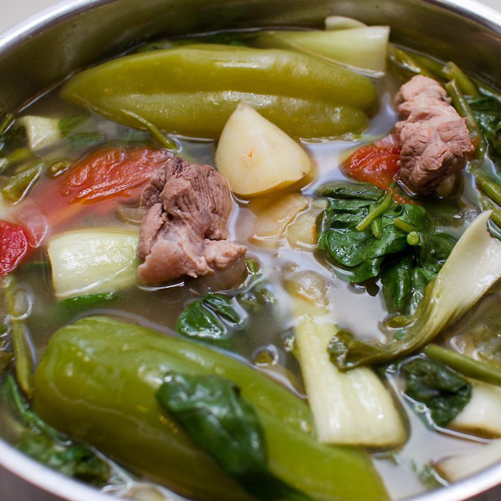 Sinigang is another soup, but unlike the aforementioned ones, the broth has a more sour flavor due to one of its main ingredients, tamarind. It can be cooked with almost any meat (seafood, beef, chicken, pork, etc.) and vegetables like bok choy, cabbage and green beans.