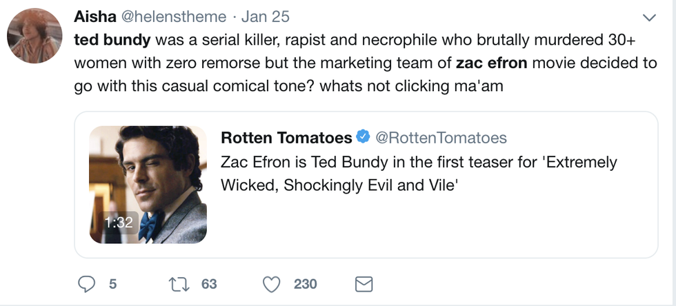 I understand that his charm and good looks are what made Bundy so dangerous, but still, something rubs me the wrong way about the casual comedic tone of the trailer. I know that Zac Efron will probably do a good job with the role, but the aura around the movie that some people are giving off is really making me doubt wanting to see the film.