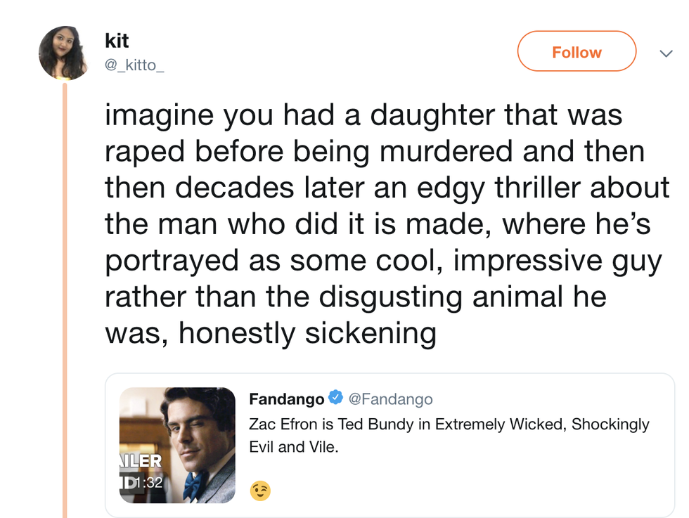 I just really hope that Ted Bundy's extreme wickedness as a human being is accurately portrayed. I also hope that the feelings of the family members who suffered from having loved ones taken from them were considered and that Hollywood just isn't getting financial gain off of the fact that a hot actor is playing a serial killer.