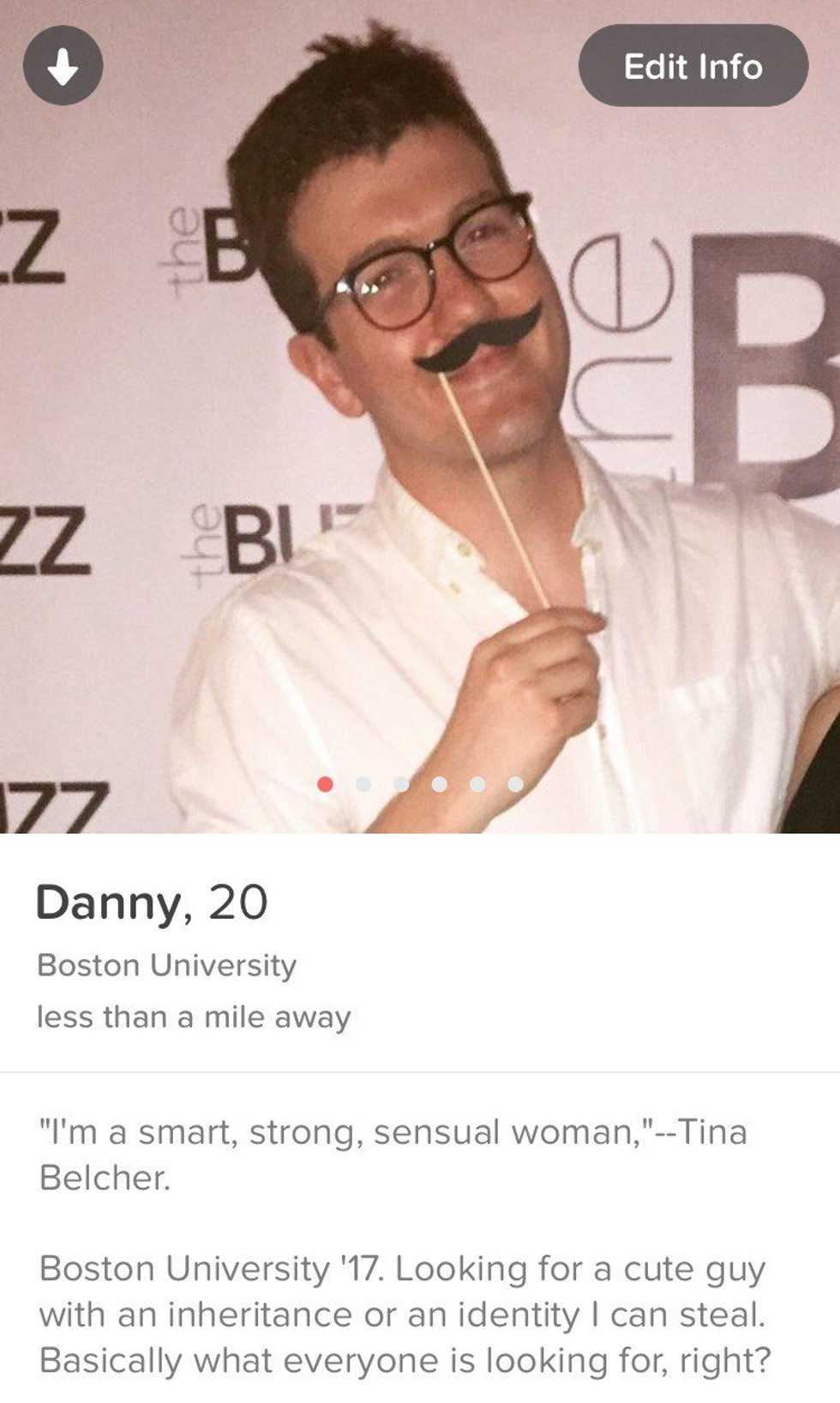 When I’m at college in Boston, it’s to see which of my friends are on the app, and who of the multiple passersby I eye-stalk on a daily basis have noticed me. It’s also an easy way to avoid heartbreak if I’m able to sort my crushes into “Str8s” and “Gays.” When I was abroad in London, it was to roughly gauge on what side of the annoying-charming line my humor fell (I wasn’t pleased with the answer). When I was traveling abroad (abroad from abroad) in Italy and Madrid, it was to see if I was beguiling to various hot European men. Apparently, I’m catnip to European dudes—if “catnip” is code for “tall skinny white boy who quotes Tina Belcher in his profile.”