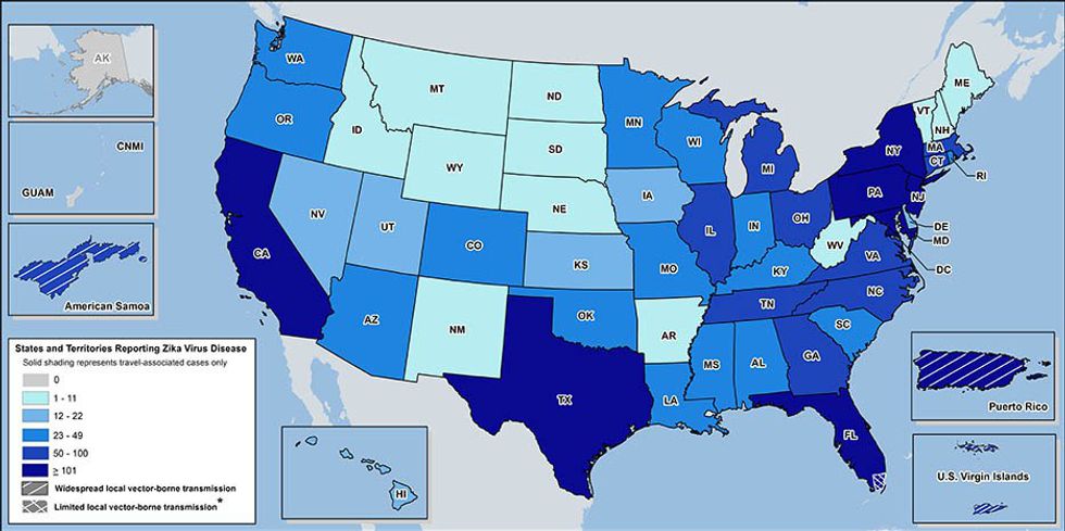 Cases have been reported in every state, except Alaska, but, so far Zika has only been contracted from mosquitos in Florida and in the US territories of American Samoa, Puerto Rico, and the US Virgin Islands.