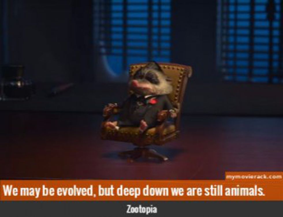 "We may be evolved, but deep down we are still animals." Mr. Big tells this to Judy. This is as true for her as it is for us. We may be evolved, but that doesn't mean we aren't humans still. We make mistakes, we love and we hate. We live and we die. But that shouldn't stop us from achieving what we want in life. Have you ever heard the saying if you fall, get back up and try, try again? We, as humans, have our own way of life no matter what.